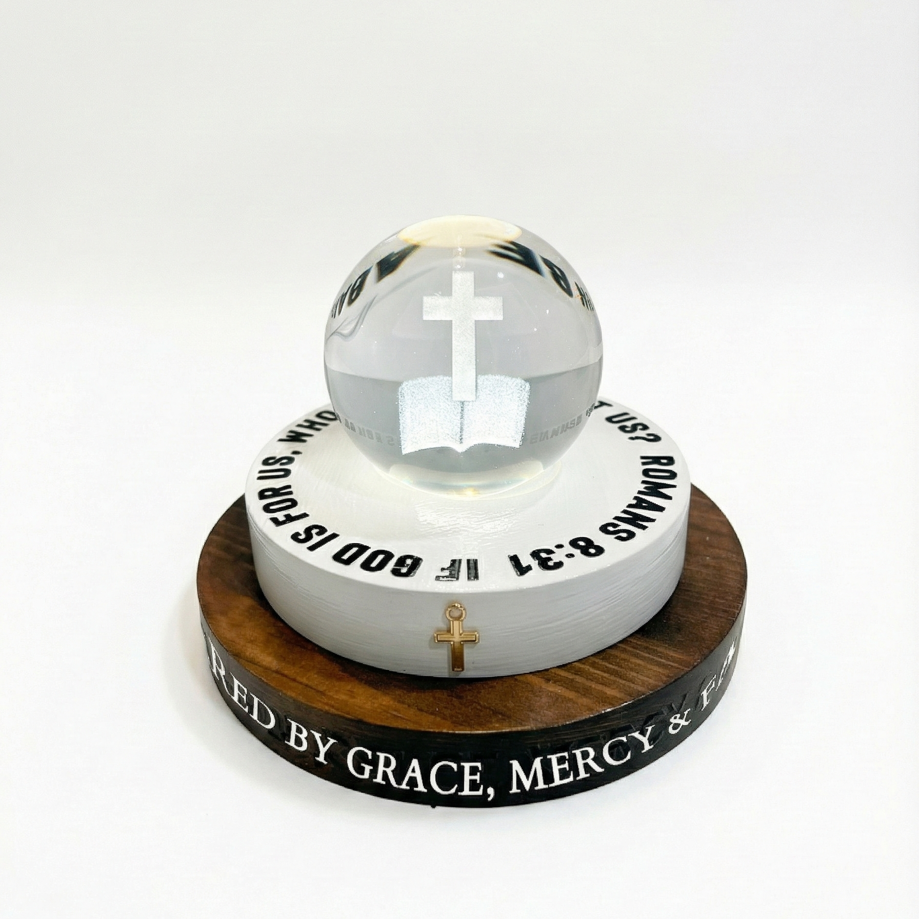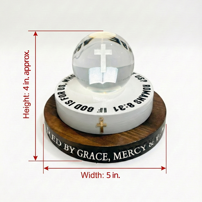 The design features a clear crystal sphere containing a laser-etched 3D open Bible and Cross, sitting atop a white hand crafted wooden tier boldly proclaiming the promise of Romans 8:31: "If God is for us, who can be against us?" A delicate gold-tone cross charm adds a touch of shine, while the dark wood base provides a sturdy foundation with a reminder of Grace and Mercy.