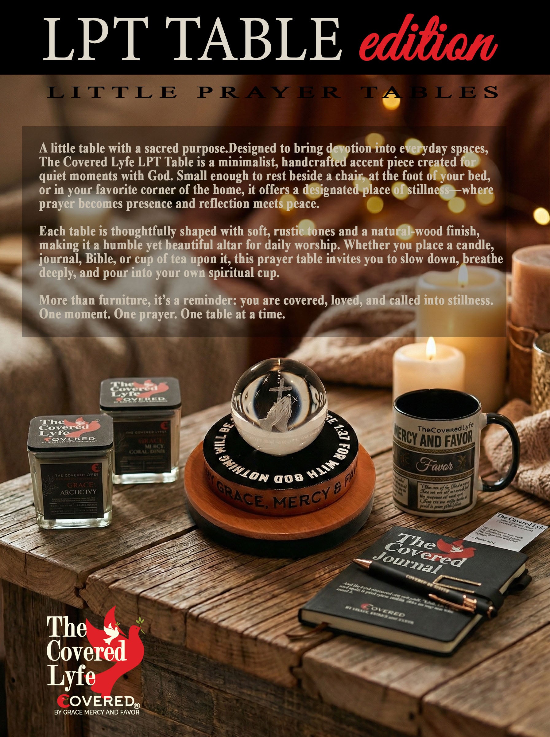- Inspirational Base: The dark wood base features the phrase "Covered by Grace, Mercy & Favor”