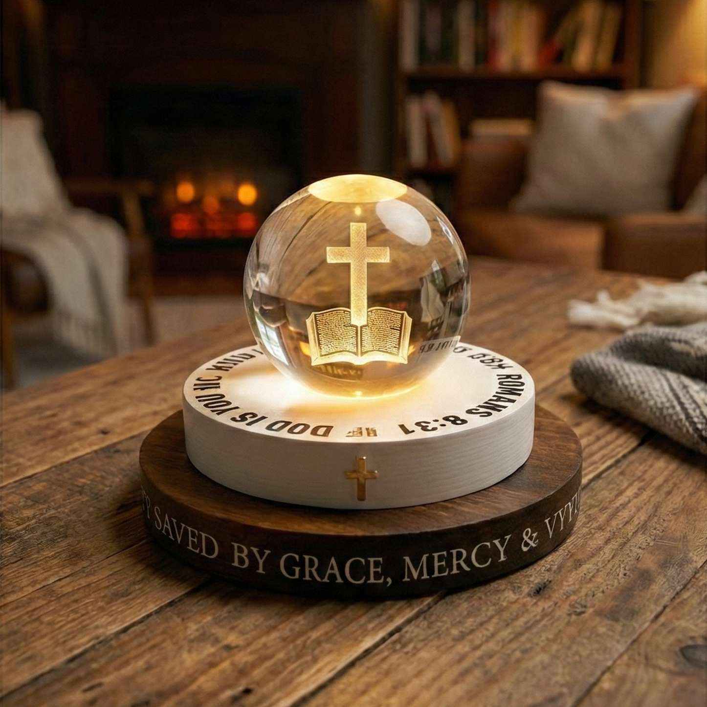 - 3D Crystal Centerpiece: High-quality glass sphere featuring an intricate laser-etched design of a Bible and Cross.