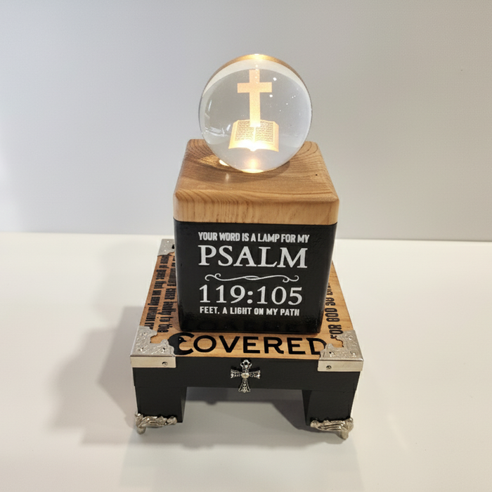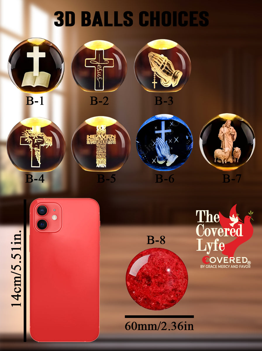 - The Crown: A clear, high-quality crystal sphere featuring a laser-etched cross floating in the center—symbolizing the light and focus of your faith, Romans 8:31 and 1 John 4:16.