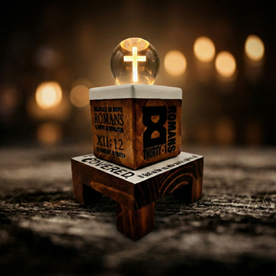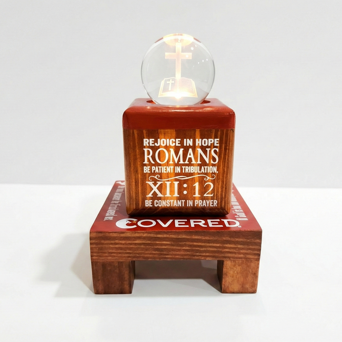 - The Core: A wooden cube block featuring the powerful command of Romans 12:12: "Rejoice in hope, be patient in tribulation, be constant in prayer."