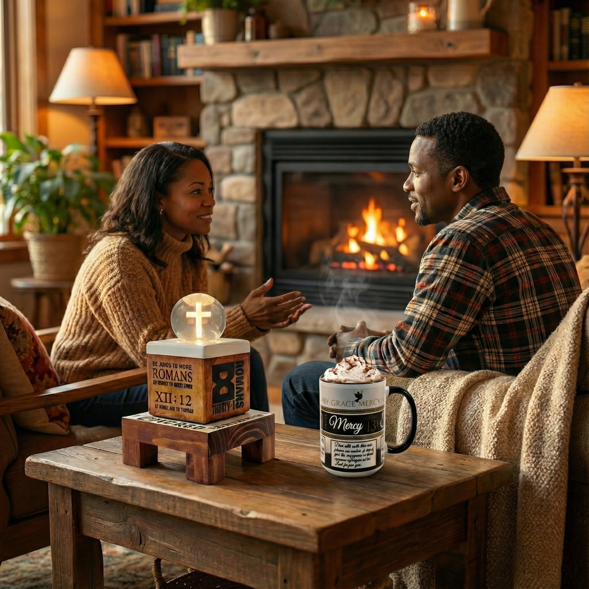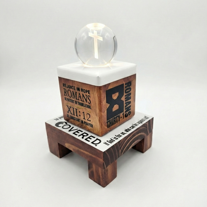 - The Foundation: A sturdy, miniature wooden "prayer table" base. The top is finished in clean white with the word "COVERED." boldly stated, alongside the reassurance of Romans 8:31: "If God is for us, who can be against us?" The other side contains 1 John 4:19: "We love because he first loved us."